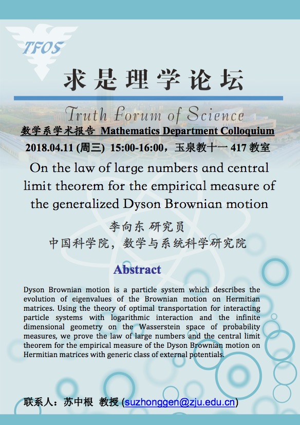 学术科研 学术团队 学术活动 学术会议 学术报告 讨论班 School Colloquium 信息公告 文件汇编 2018 开云手机入口 > On the law of large numbers and central limit theorem for the empirical measure of the generalized Dyson Brownian motion 来源:开云(中国) 发布时间:2018-04-08 627