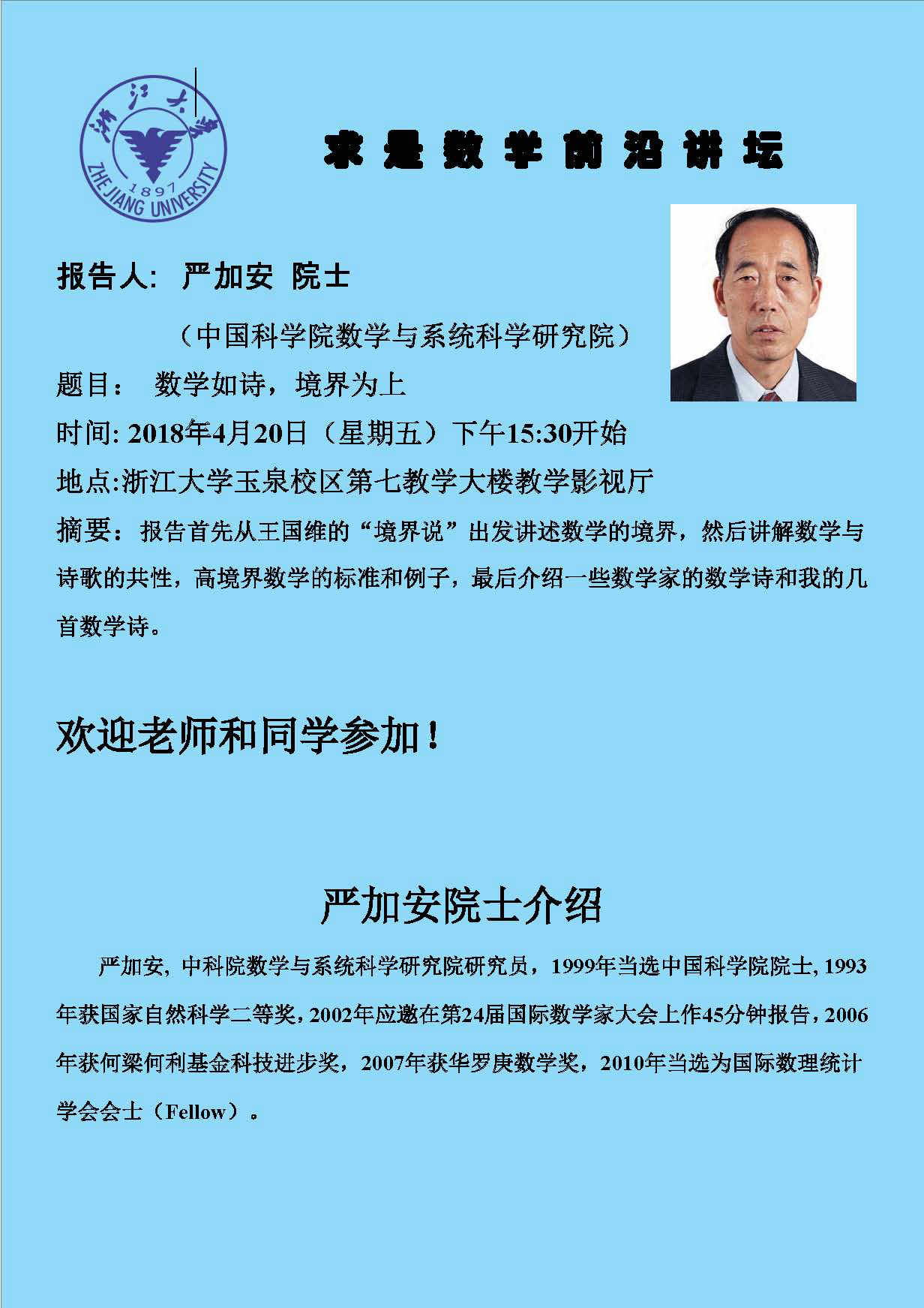 学术科研 学术团队 学术活动 学术会议 学术报告 讨论班 School Colloquium 信息公告 文件汇编 2018 开云手机入口 > 严加安院士题为“数学如诗,境界为上”的公众演讲 来源:开云(中国) 发布时间:2018-04-08 763