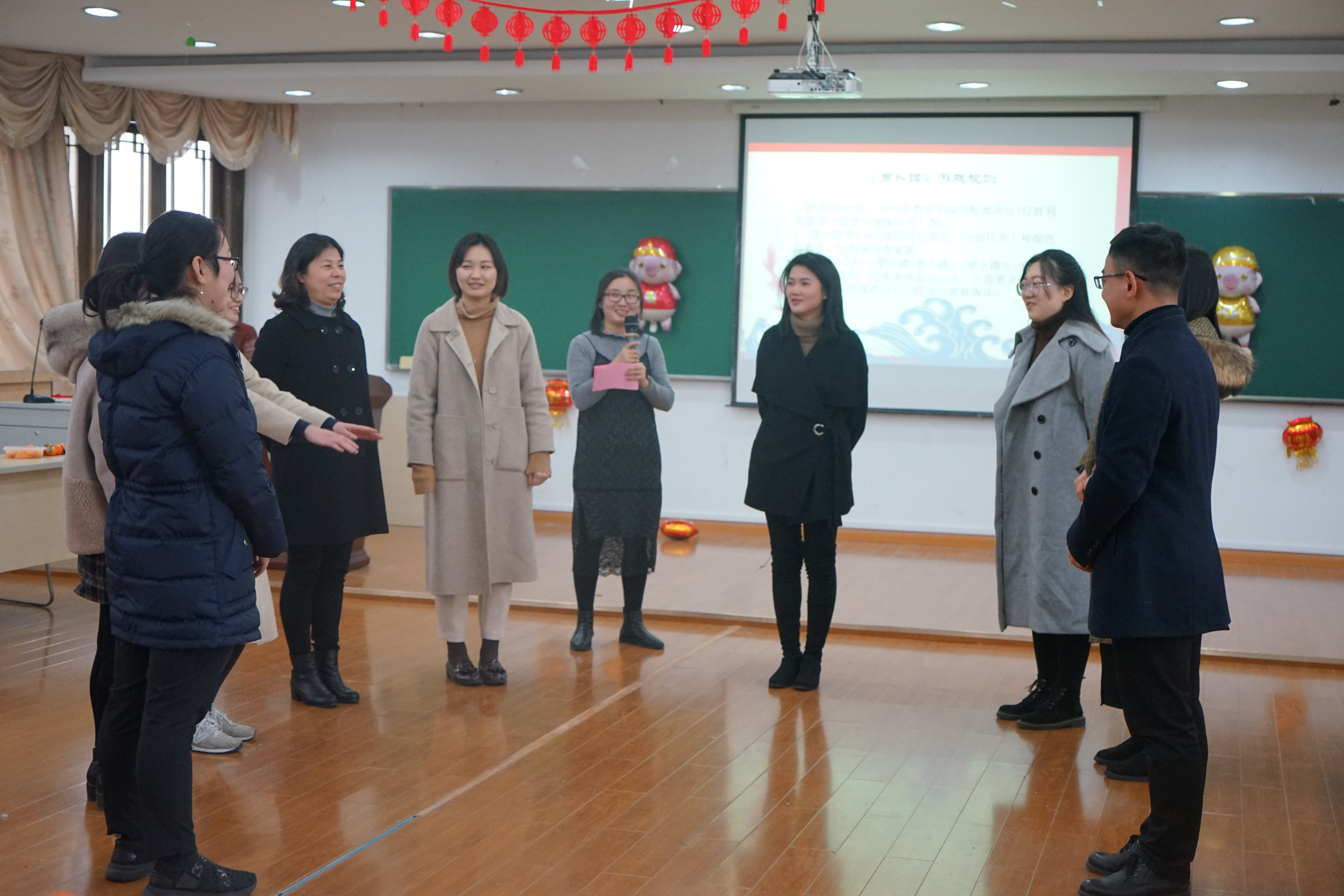 随后,现场进行了热身小游戏环节。主持人介绍完规则,九位老师化身九色萝卜,现场表演《萝卜蹲》。几轮过后,三位老师站到最后,获得一份精美的小礼品。“萝卜”退场后,主持人拿出一顶精致的“高帽”。这是一顶来自霍格沃茨魔法学校的神奇礼帽,带上它的人将会获得所有人的赞许。