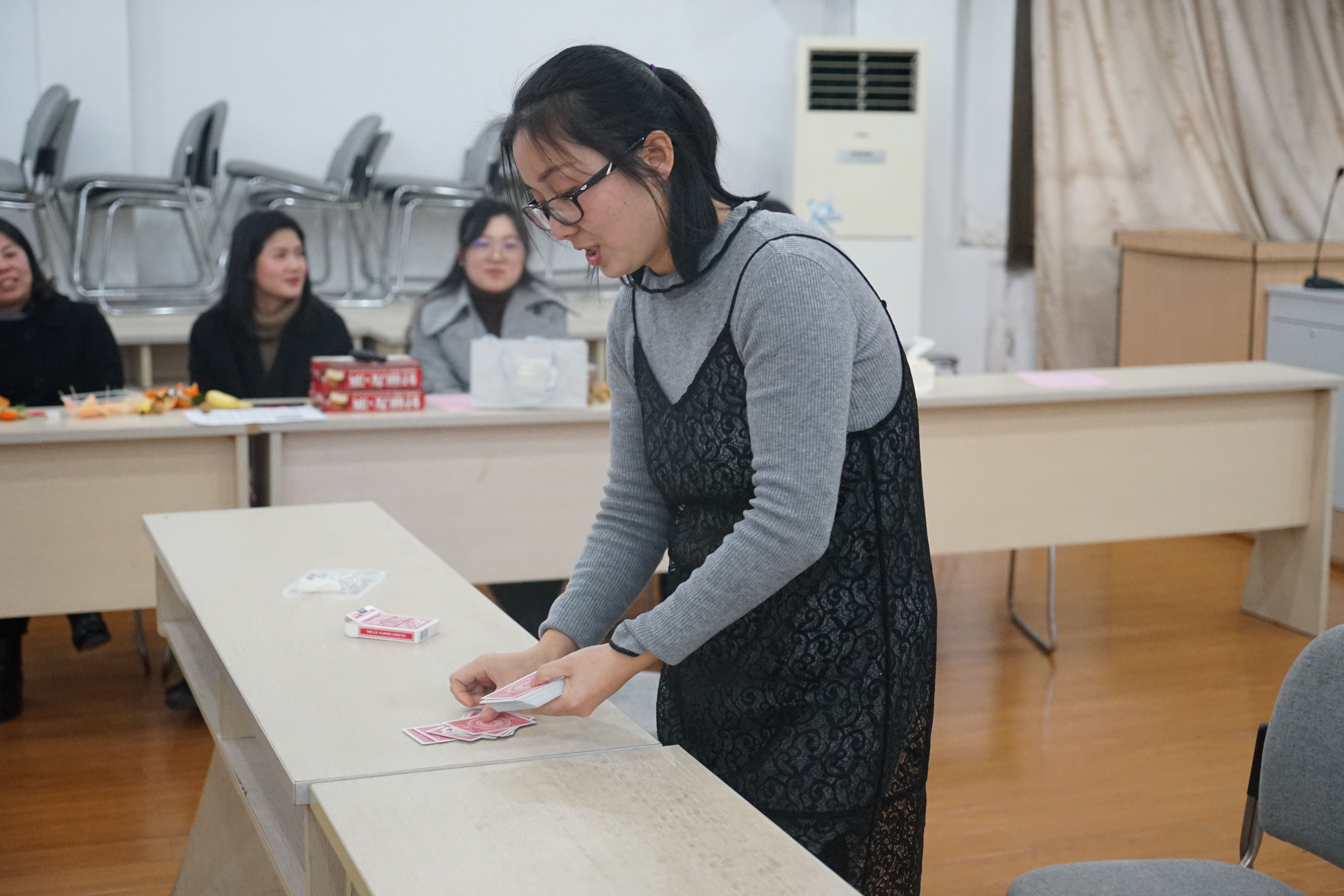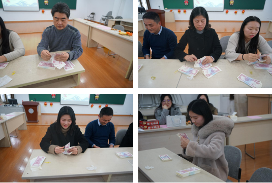 半场已过,现场正酣。几位老师为大家表演了别开生面的娱乐节目――《数钱数到手抽筋》。主持人陈卫老师也化身魔术师,给大家带来了一段魔术表演。一副普通的扑克牌,加上一双灵巧的手,成就了一场精彩的魔术。入职仅俩月,凭借过人的智慧,在一群数院老师面前玩起了数字游戏,丝丝入扣,令人折服。
