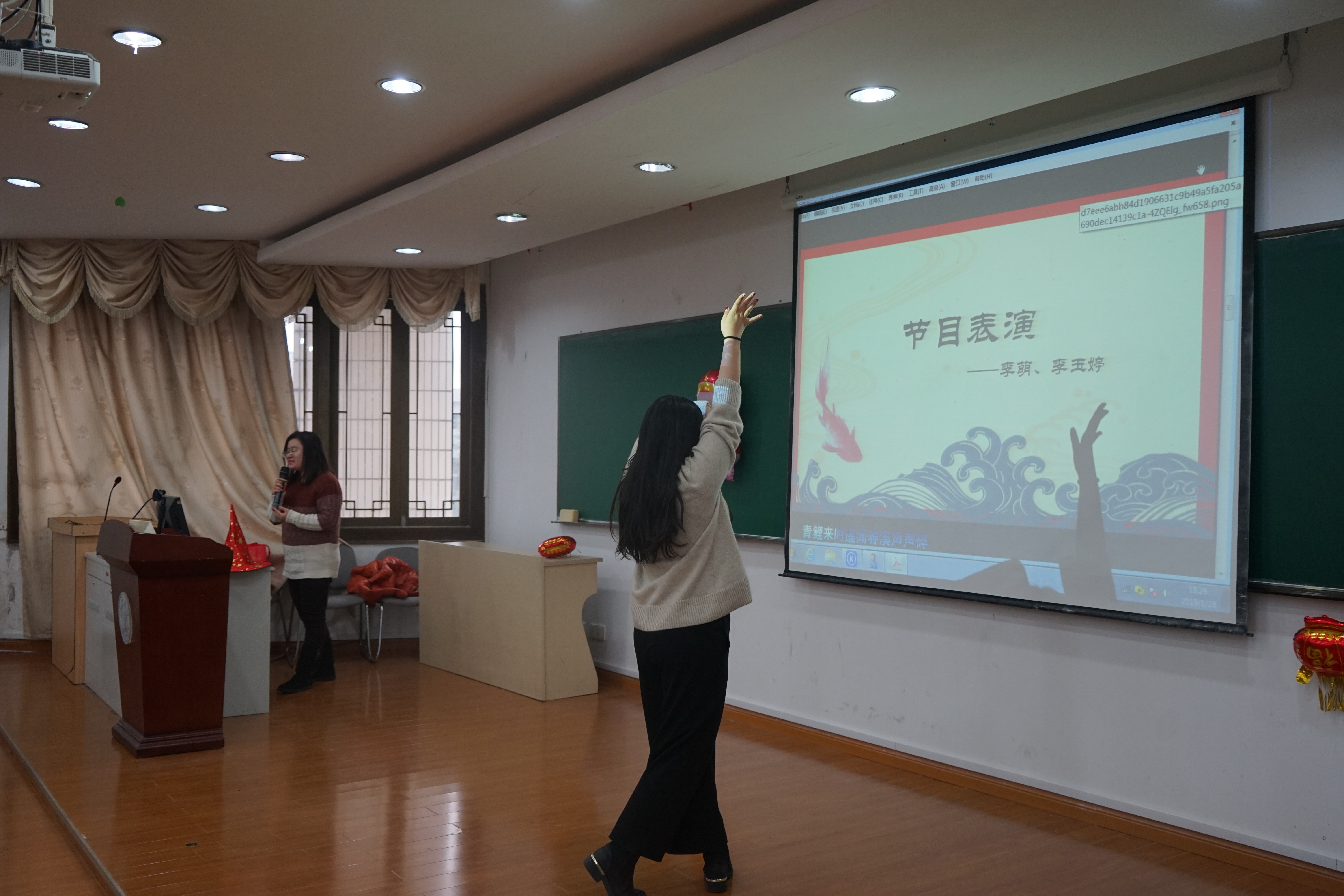 接下来,李萌老师和李玉婷老师为大家带来了歌舞表演。一曲《棠梨煎雪》,伴着一段动感舞蹈。优美的歌声,高雅的舞步,赢得了现场阵阵掌声。