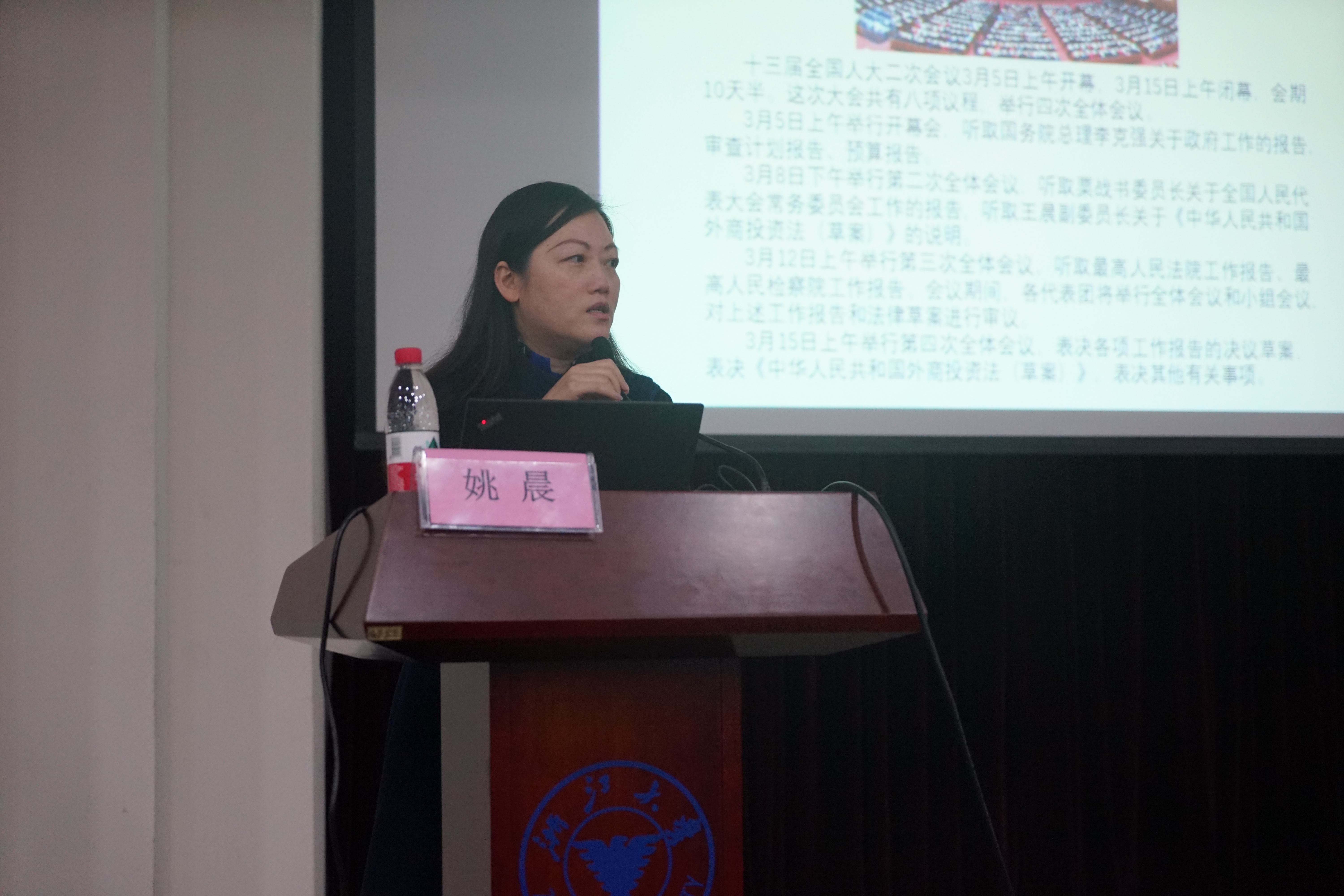 首先,姚晨老师向党员们介绍了2019年全国两会的主要议程,以及习近平总书记在两会时参加各个代表团审议会时发表的重要讲话。结合同学们关注的话题,姚老师分别从文化、生态、民生、就业、科研等方面进行了解析。姚老师提到作为新时代的大学生,应牢记记录新时代、书写新时代、讴歌新时代的使命,深刻领会习近平总书记重要讲话精神,为祖国的建设贡献出自己的一份力量。