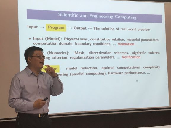 在分析收敛性的同时,陈院士以诙谐幽默的语言讲述数学和物理思维的不同。陈院士着重指出在数学中,唯一性的重要性,也就是现实世界(物理实验)的解与数学模型的解不一定是一致的,只有验证数学模型的解是唯一的,我们做物理实验才能更加“自信”。同时陈院士也指出,多年来,某个数学问题悬而未决的情况时常出现,好的想法需要被启发,大家仍面临着巨大的挑战,需要坚持不懈地共同努力。