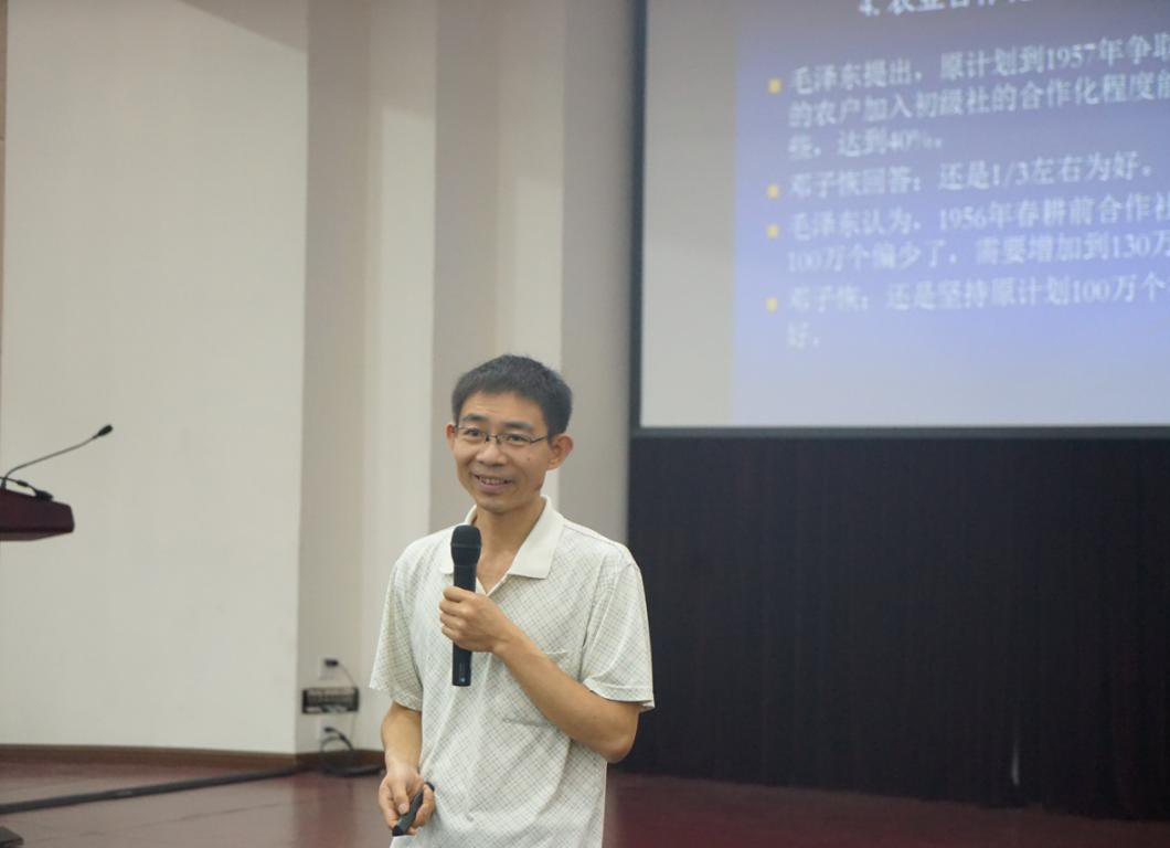 刘召峰老师从学者角度出发,以“向社会主义过渡”、“社会主义建设道路的前期探索”、“中国特色社会主义”、“关于中国向何处去的论争”、“对论争的剖析”等方面,带领党员们回顾了建国七十年来的历史足迹。刘老师结合每一个事件的具体发生时间和背景科学分析利与弊,客观的点评了建国七十年来重要历史事件。
