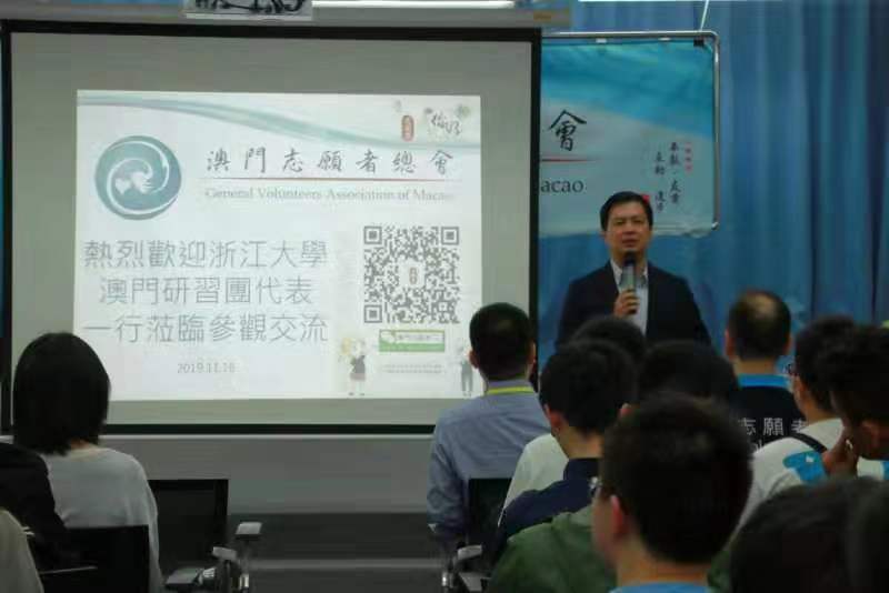 此外,交流团一行还有幸参访澳门志愿者总会,受到澳门志愿者总会会长白琪文先生、常务副会长林伦伟先生等的热情接待。林副会长向大家介绍了志愿者总会及各分会的发展历程和会务工作情�,白会长表示期望加�双方在志愿者服务领域的合作,共同为促进共同推动浙澳两地的融合发展,与两地青年携手建设社会,为中华民族伟大复兴的中国梦奉献自身力量。