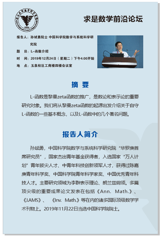通知公告 通知公告 重要通知 本科生 研究生 科研 教学 人事 公示 学术活动 学术会议 新闻图片 院系新闻 院内邮件 重要通知 开云手机入口 > 求是数学前沿论坛之孙斌勇院士讲座 来源:开云(中国) 发布时间:2019-12-18 1026