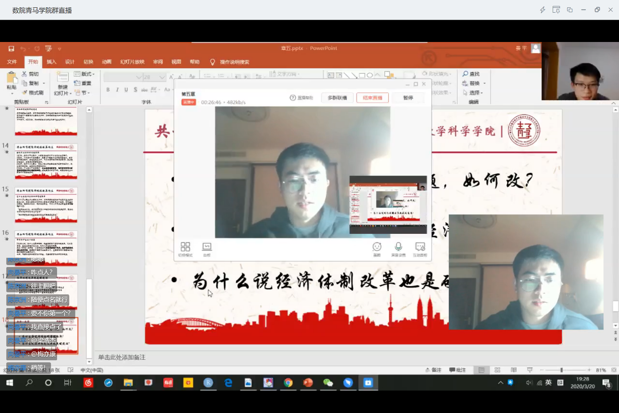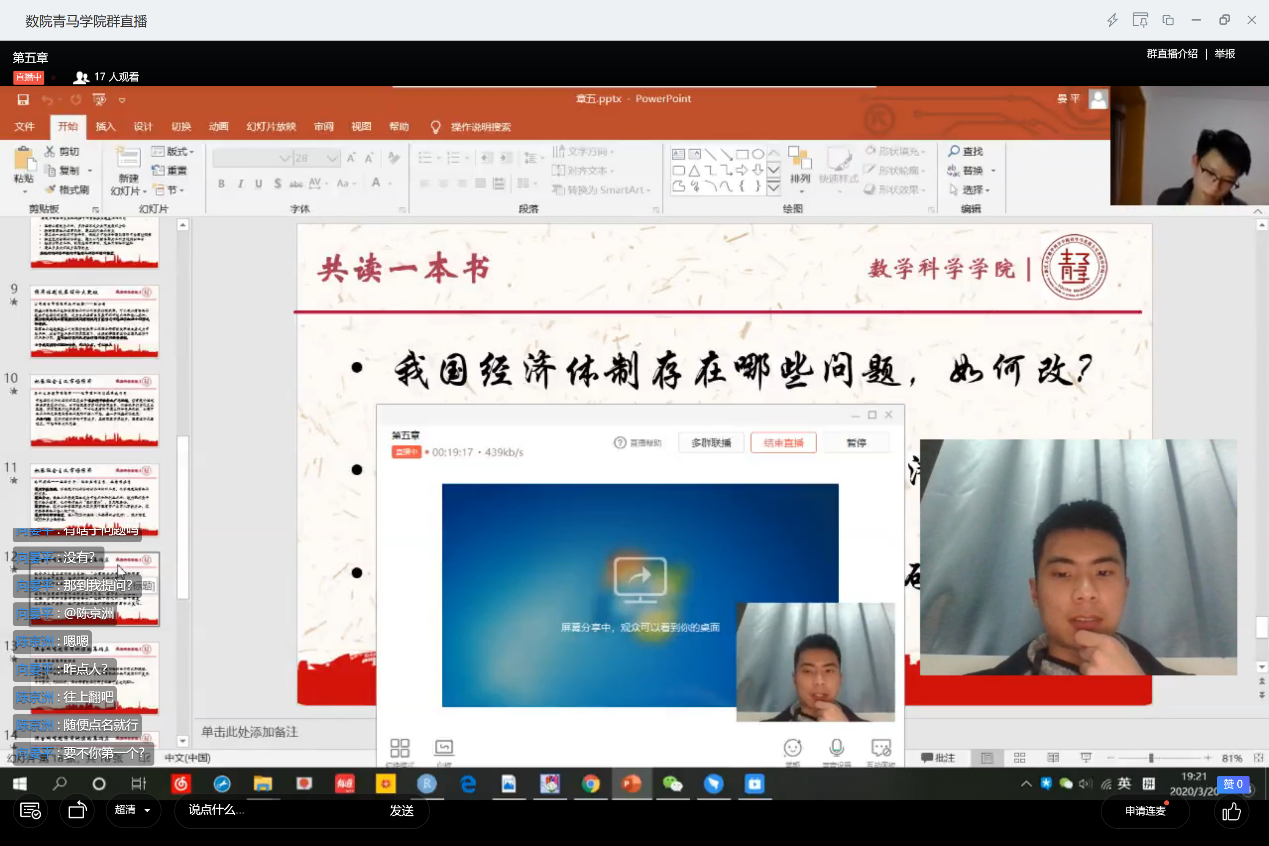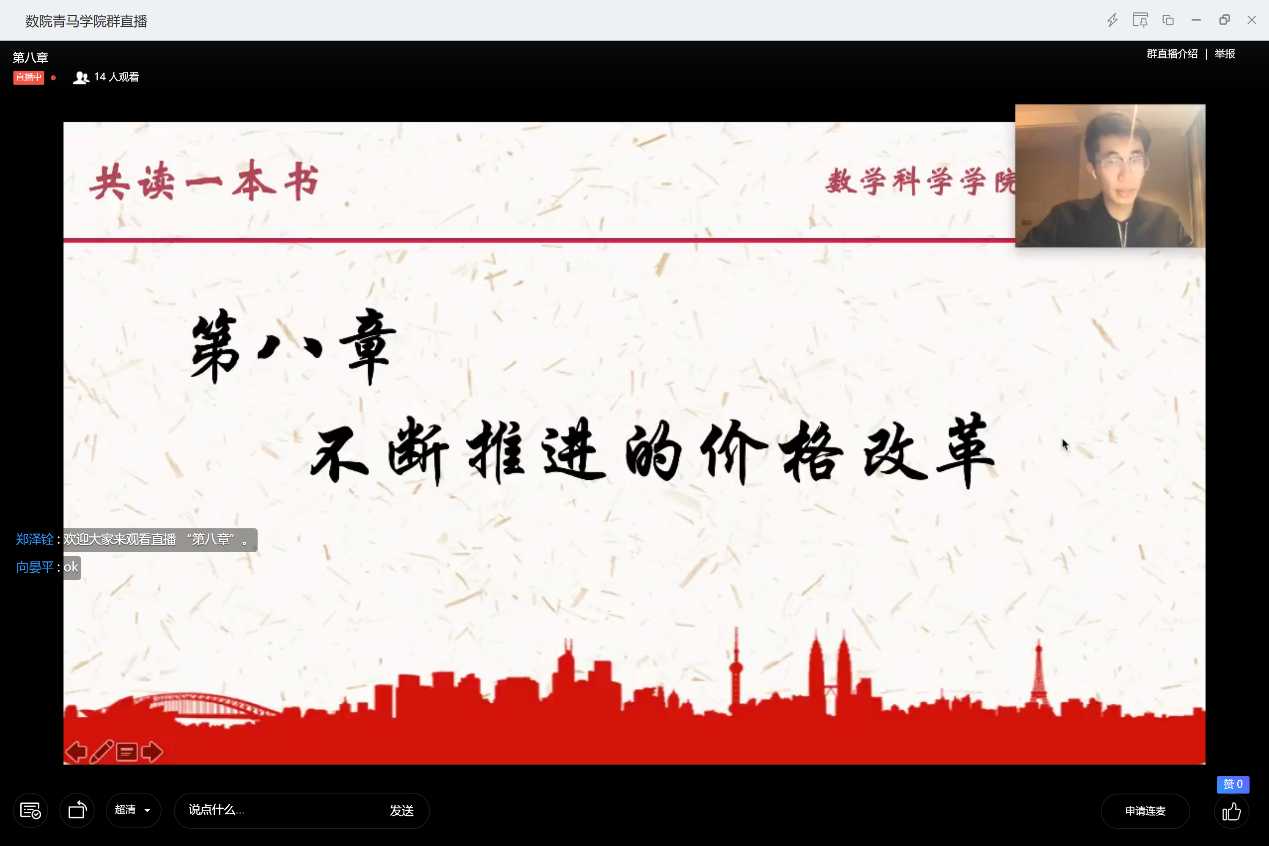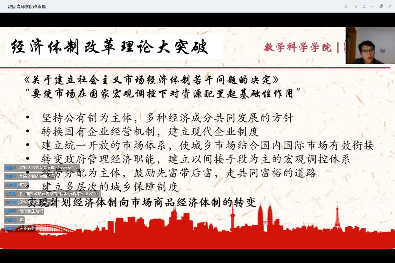 向晏平同学分享了第五章《绕不过的经济体制改革》。在简单概括了经济体制改革的框架后,向同学首先从1979年无锡全国经济讨论会谈起,在当时的会议上首次将社会主义经济同商品经济、市场经济联系起来,在理论上取得突破。而后,为了让市场和价值规律起作用,社会主义市场经济从星星之火渐渐成为时代主流。之后,为了更具体地揭示出社会主义市场经济在发展历程中的特点,向同学继续分析了混合所有制经济。最后向同学总结了目前经济体制改革中存在的三个问题。在之后的提问环节中,学员们积极互动,一起加深了对问题的理解!
