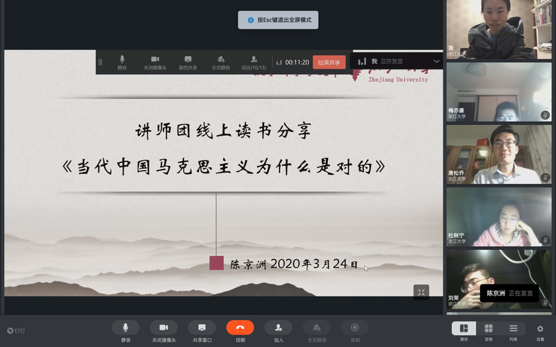 2020年3月24日晚上8点,开云(中国)“核心价值观进班级”讲师团第三次线上读书交流分享会如期召开。本期分享会由陈京洲和唐松乔两位同学主讲,他们分别对《当代中国马克思主义为什么是对的》一书的第五章和第六章做了内容梳理与心得体会的分享。
