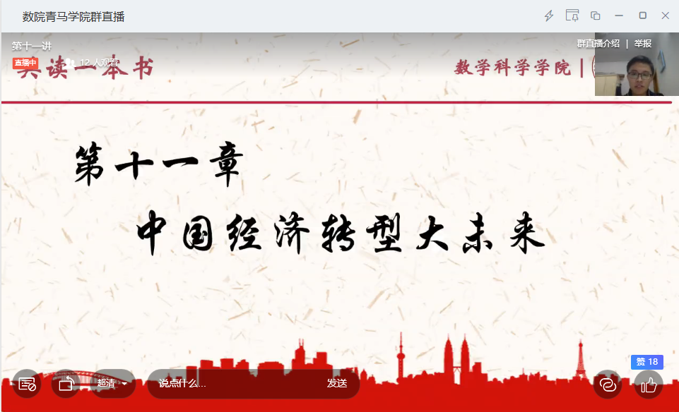 张雨晴同学分享了第十章《迈过经济转型的坎儿》。张同学从中国经济发展若不能转型成功,容易跌入“中等收入陷阱”,难以实现全面现代化这一雄伟目标出发,引出了转型的挑战以及解决的措施。面对资源环境的挑战,可以大力调整经济结构,抑制高消耗高排放高污染行业的过快增长;面对投资增速过快与内需不足产能过剩,可以通过市场竞争优胜劣汰;面对居民收入差距过大,可以注重公平分配;面对第三产业发展滞后问题,可以加快发展第三产业来扩大内需。在之后的提问环节中,学员们积极互动,加深了理解。