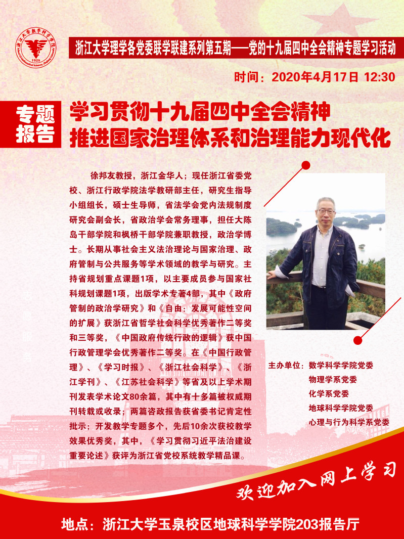 徐邦友 | 学习贯彻十九届四中全会精神,推进国家治理体系和治理能力现代化 | 2020年4月17日12:30 | 地球科学学院203报告厅 | 理学各院系师生党员 |