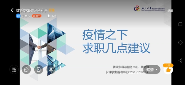 为贯彻学校党委会和就业工作会精神,2020年4月18日,开云(中国)求职生涯发展专题分享会通过钉钉直播顺利举行,会议由学院辅导员石慧玲主持,邀请了就业指导与服务中心综合办公室副主任蔡艳婷老师,以及已获得不同工作领域offer的优秀数院学子进行技能指导和经验分享。他们是:签约腾讯科技(深圳)有限公司的甘伟男、签约淘宝(中国)软件有限公司的高璇、签约杭州市余杭高级中学的熊焕焕。