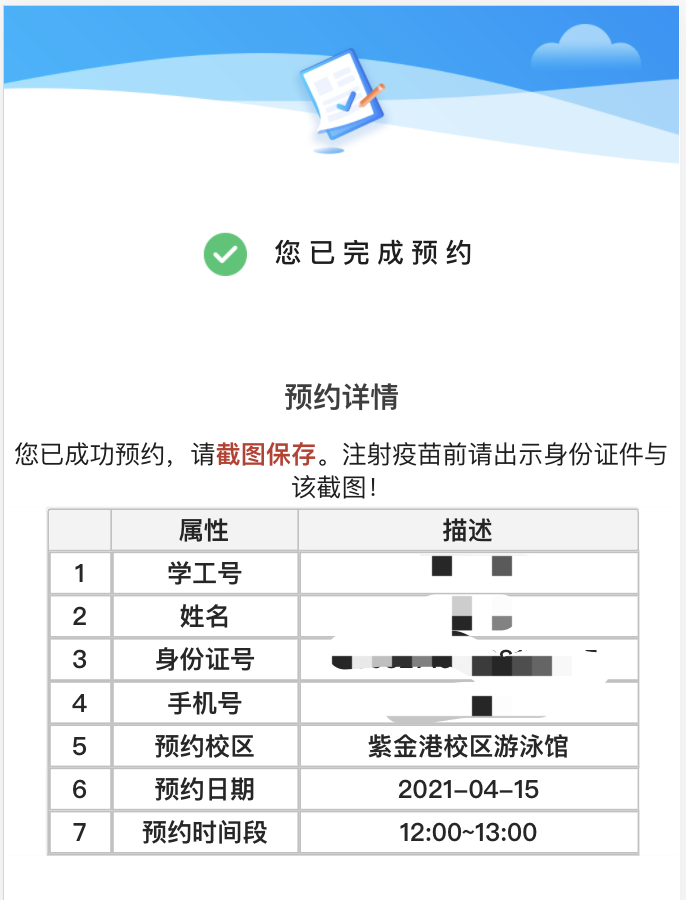 预约成功之后会显示预约详情,可截图保存,或再次进入点击“新冠疫苗接种预约”也会进入本人预约详情页面。注射疫苗前请出示身份证件与该截图!