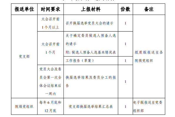 (四)党支部委员会一般每届任期3年,期满按期换届。任期将满的党支部,提前4个月向上级党组织报送换届请示,并提前1个月(2022年3月15日前)报送书面换届请示至学院党委(相关材料范例请见附件)。如需延期或提前换届的,应报学院党委批准,延长或者提前期限一般不超过 1 年。