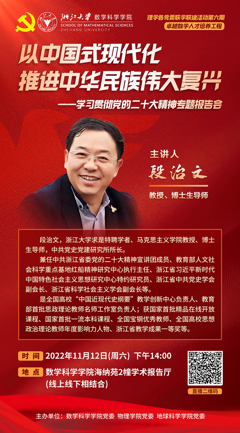 为深化落实党中央及上级党组织、学校党委关于学习宣传贯彻党的二十大精神的部署,深入学习、深刻领会党的二十大的重大意义和二十大报告的深刻内涵,用新思想指导新发展阶段“双一流”建设和发展,数学科学学院将学习宣传贯彻党的二十大精神作为当前和今后的一项重要政治任务,以更高的政治站位和政治自觉,全面系统开展学习贯彻落实党的二十大精神专题活动。联合理学各党委共同组织学习贯彻党的二十大精神专题报告会,本次活动也系学院卓越数学人才培养工程、党员“先锋学子”专题教育、党团学骨干专题培训等活动重要环节,现将活动具体安排通知如下: