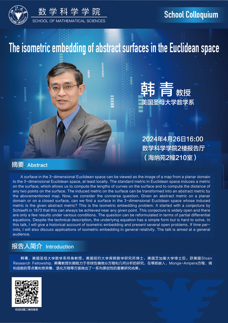 通知公告 通知公告 学术活动 学术会议 新闻图片 院系新闻 院内邮件 2024 开云手机入口 > School Colloquium——The isometric embedding of abstract surfaces in the Euclidean space 来源:开云(中国) 发布时间:2024-04-19 443