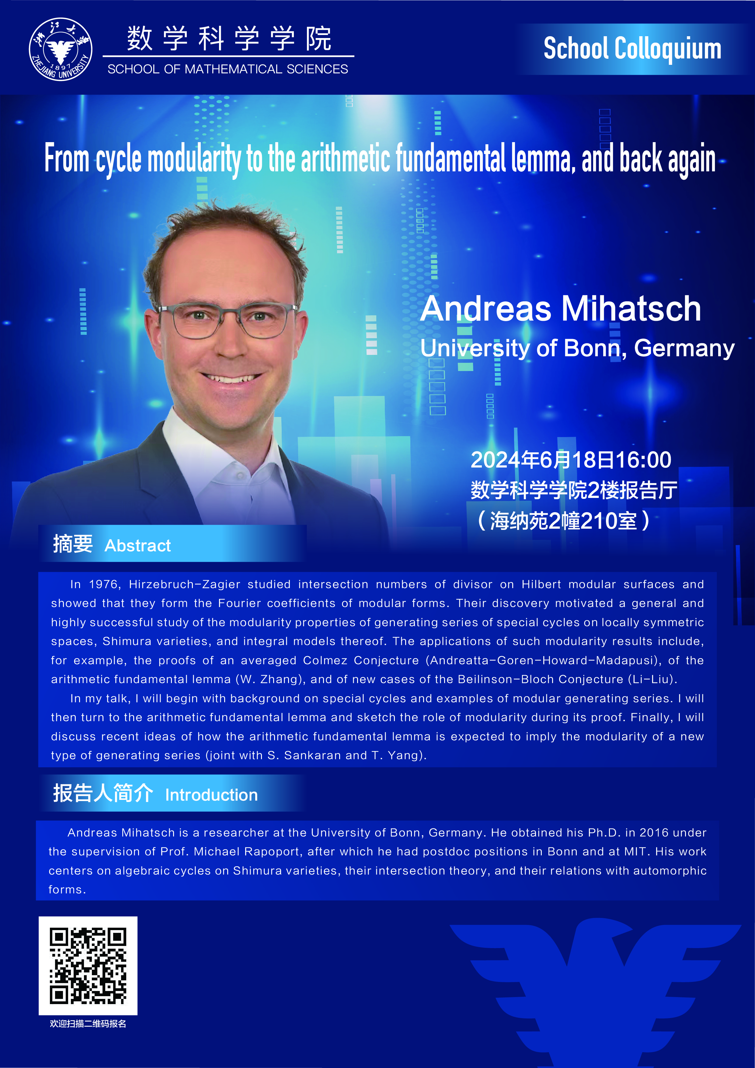 通知公告 通知公告 学术活动 学术会议 新闻图片 院系新闻 院内邮件 2024 开云手机入口 > School Colloquium——From cycle modularity to the arithmetic fundamental lemma, and back again 来源:开云(中国) 发布时间:2024-06-17 266