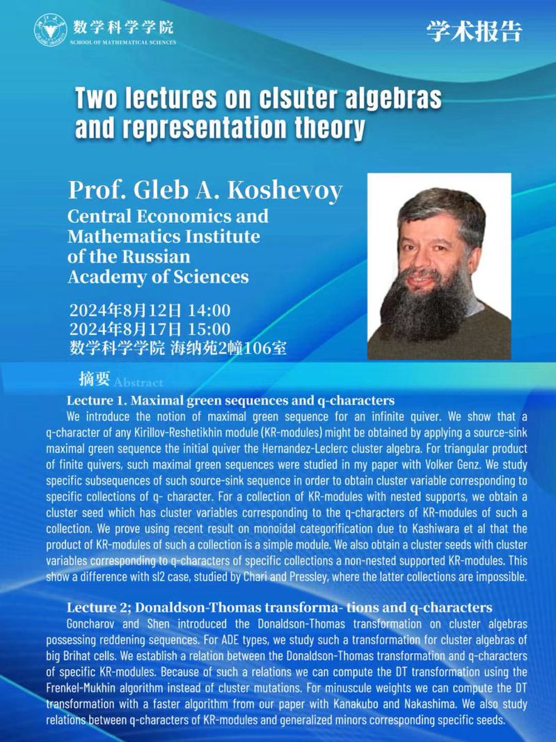 学术科研 学术团队 学术活动 学术会议 学术报告 讨论班 School Colloquium 信息公告 文件汇编 表示论与数论讨论班 开云手机入口 > 代数与表示论讨论班——Two lectures on cluster algebras and representation theory 来源:开云(中国) 发布时间:2024-08-08 307