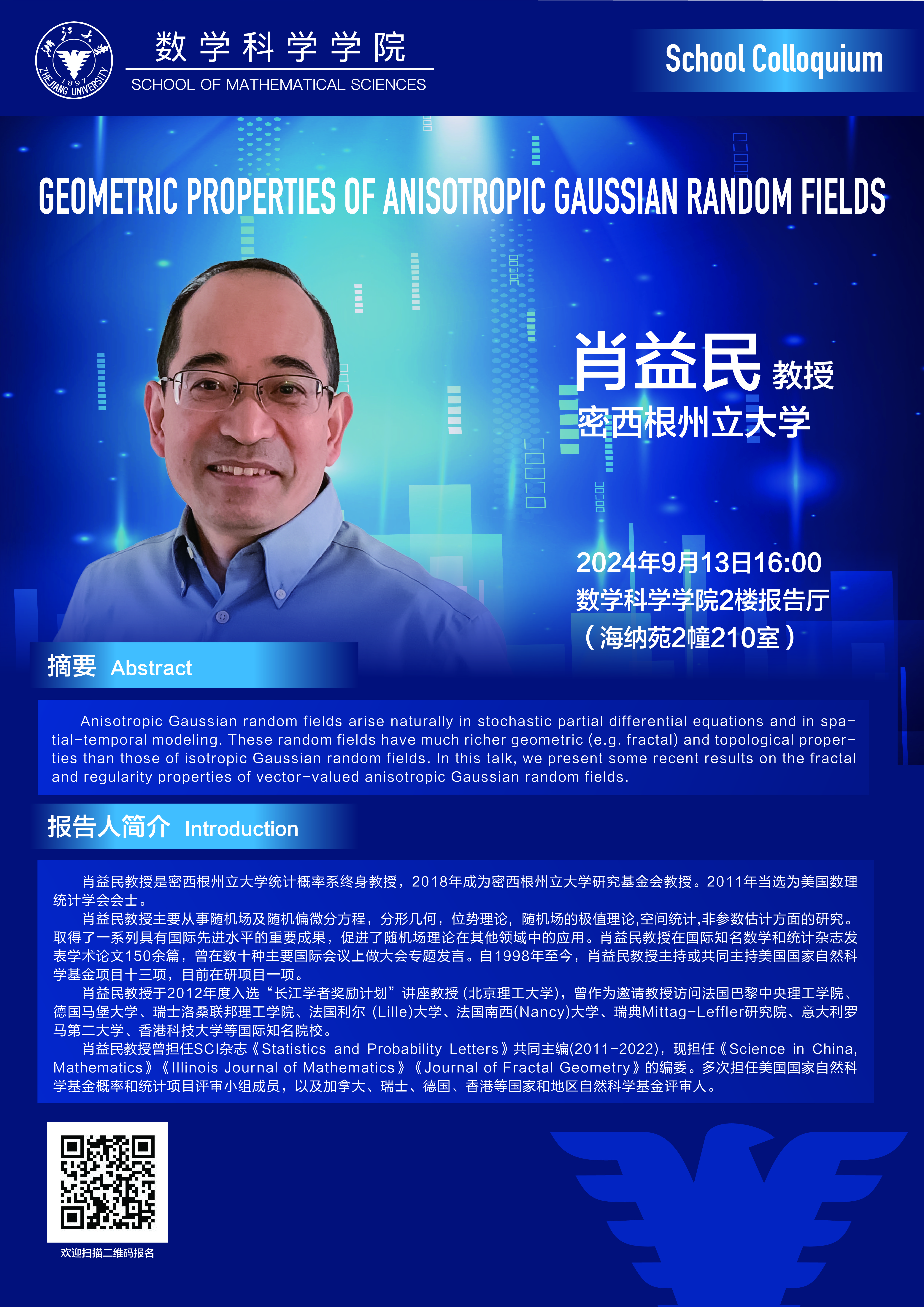 学术科研 学术团队 学术活动 学术会议 学术报告 讨论班 School Colloquium 信息公告 文件汇编 学术活动 开云手机入口 > School Colloquium——GEOMETRIC PROPERTIES OF ANISOTROPIC GAUSSIAN RANDOM FIELDS 来源:开云(中国) 发布时间:2024-09-06 428