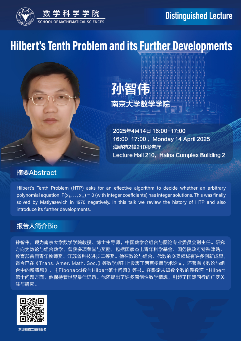 学术科研 学术团队 学术活动 学术会议 学术报告 讨论班 School Colloquium 信息公告 文件汇编 School Colloquium 开云手机入口 > Distinguished Lecture——Hilbert's Tenth Problem and its Further Developments 来源:开云(中国) 发布时间:2025-04-08 23