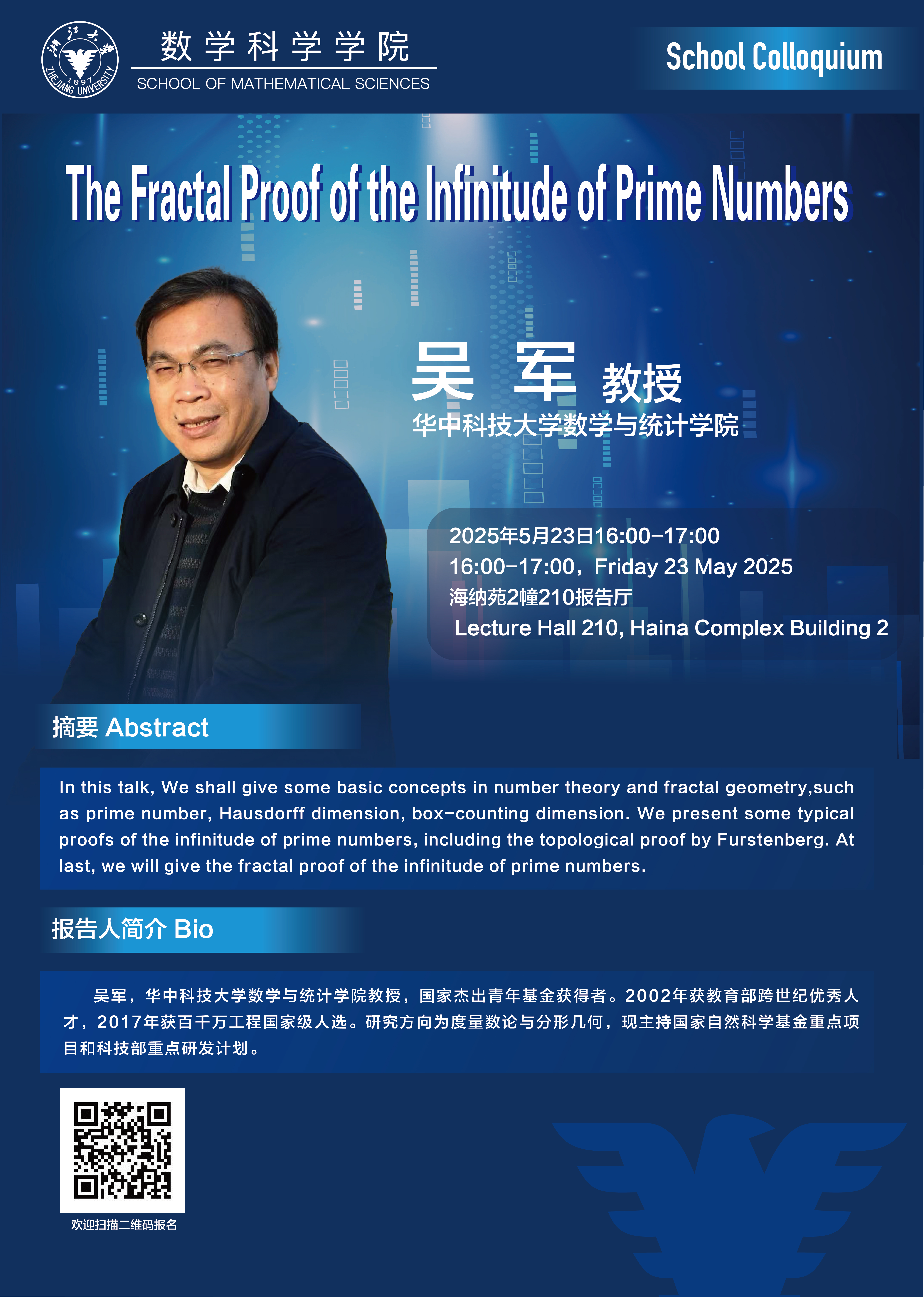 学术科研 学术团队 学术活动 学术会议 学术报告 讨论班 School Colloquium 信息公告 文件汇编 学术活动 开云手机入口 > School Colloquium——The Fractal Proof of the lnfinitude of Prime Numbers 来源:开云(中国) 发布时间:2025-05-20 214
