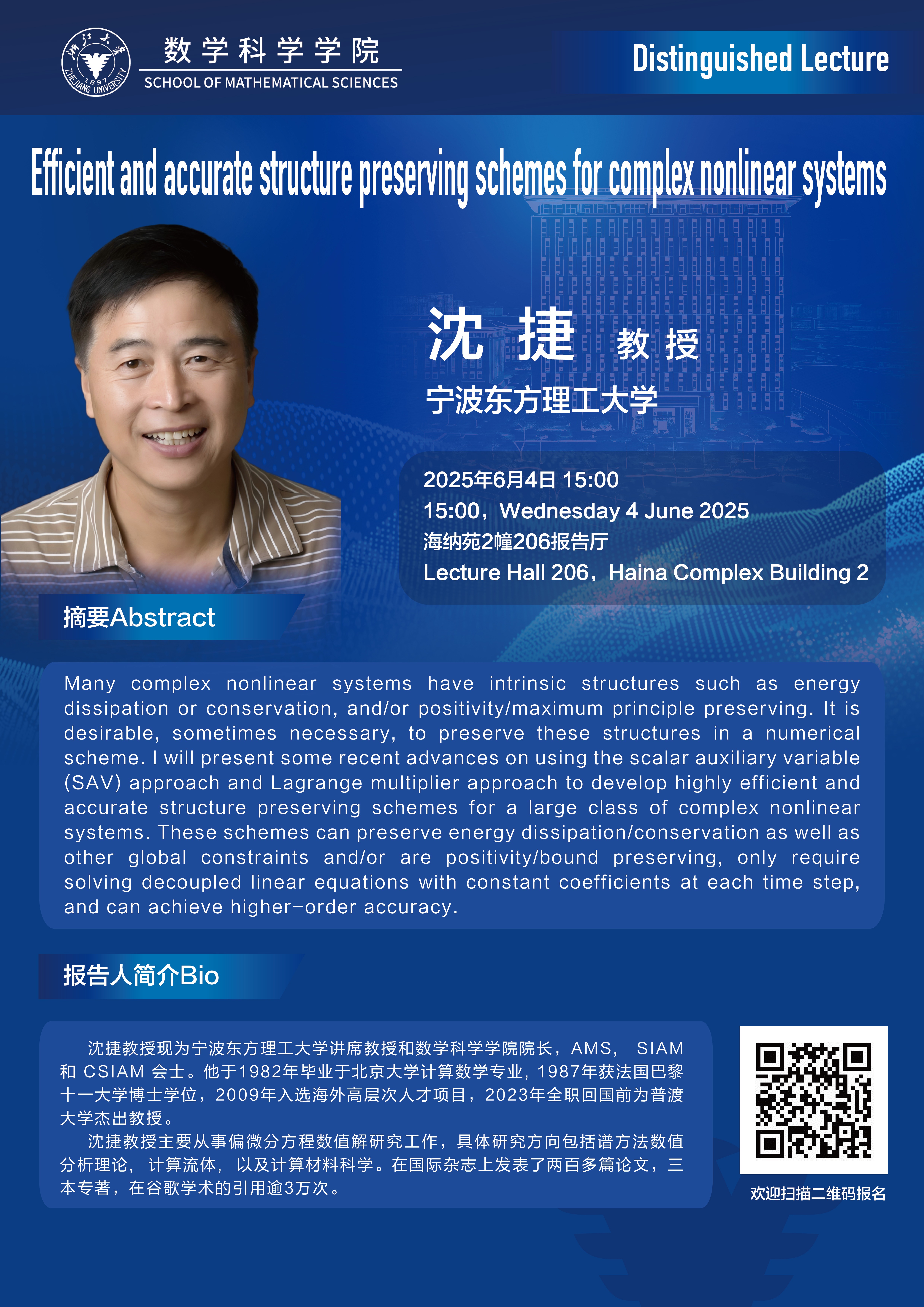 学术科研 学术团队 学术活动 学术会议 学术报告 讨论班 School Colloquium 信息公告 文件汇编 School Colloquium 开云手机入口 > Distinguished Lecture——Efficient and accurate structure preserving schemes for complex nonlinear systems 来源:开云(中国) 发布时间:2025-06-03 24