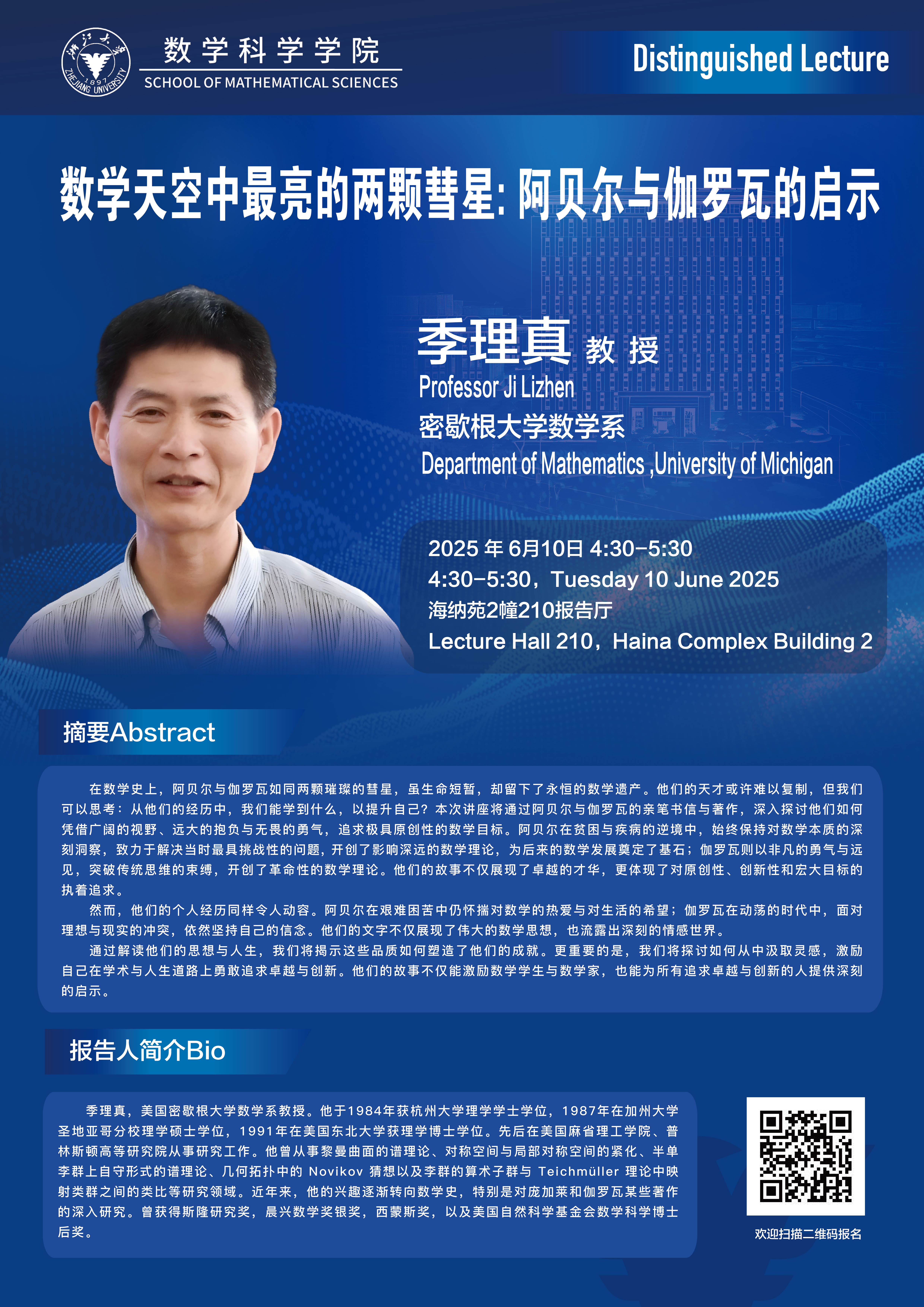 学术科研 学术团队 学术活动 学术会议 学术报告 讨论班 School Colloquium 信息公告 文件汇编 School Colloquium 开云手机入口 > Distinguished Lecture——数学天空中最亮的两颗彗星: 阿⻉尔与伽罗⽡的启示 来源:开云(中国) 发布时间:2025-06-07 21