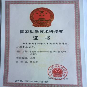 On January 8, the National Annual Science and Technology Awards Conference was held by the CPC Central Committee and the State Council in Beijing. Professor CAI Tianxin has won a second prize of the National Science and Technology Progress Award for his book titled Legends of Mathematics: Those Great Mathematicians.