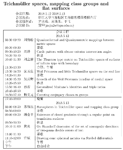 Seminars Seminars School Colloquium Conferences Position : homepage EVENTS Seminars Teichmüller spaces, mapping class groups and flat surfaces Speaker : Time : Location : 会议日期: 2018.5.12-2018.5.13 会议地点:浙江大学玉泉校区工商管理楼四楼报告厅会议组织者:尹永成、王晓光、于飞 会议秘书:贾甲(jiajia2u@zju.edu.cn)标题和摘要,请见附件:标题和摘要.pdf Date: 2018-04-17 Visitcount : 1560