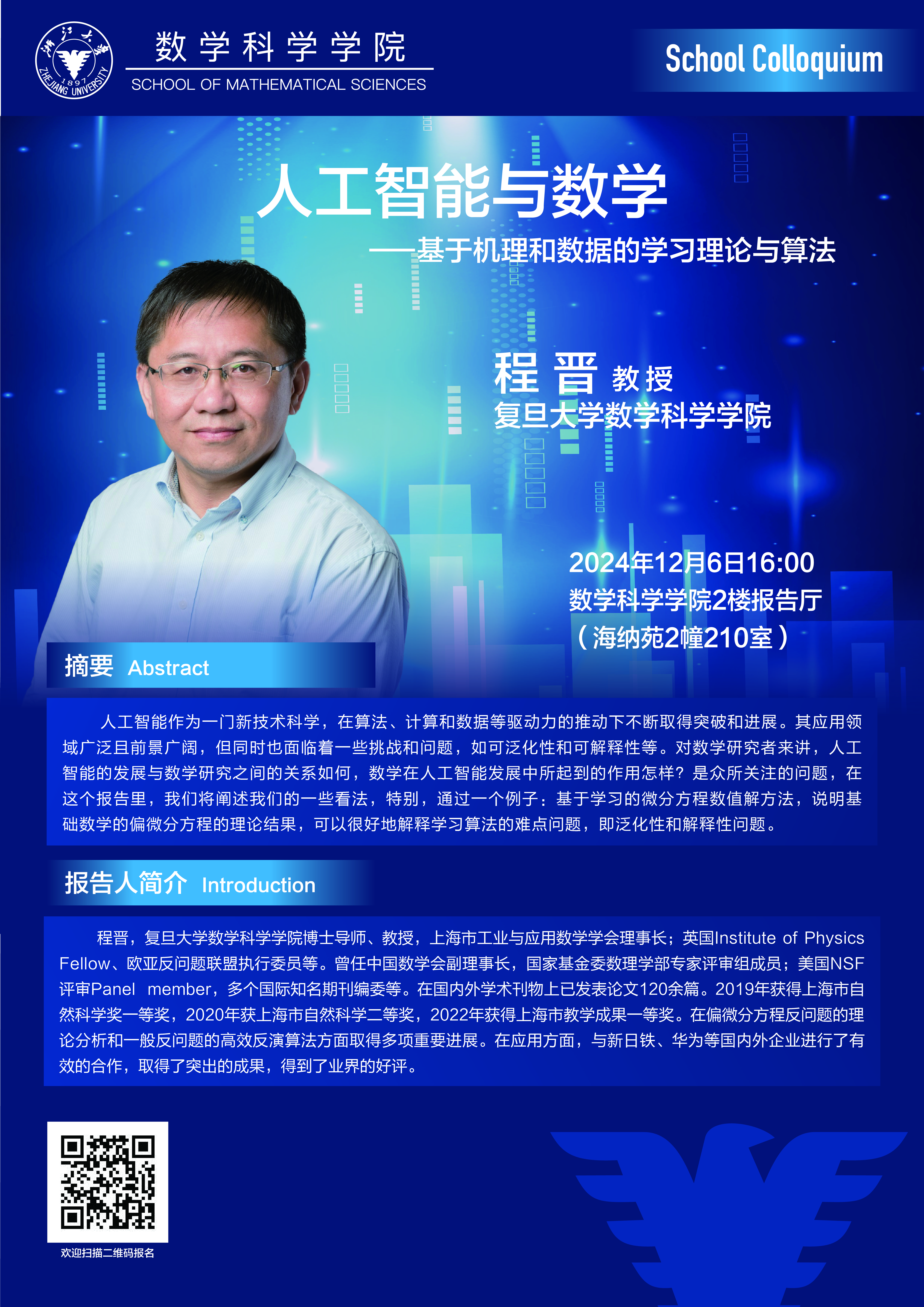 Seminars Seminars School Colloquium Conferences Position : homepage EVENTS Seminars School Colloquium——人工智能与数学--基于机理和数据的学习理论与算法 2024-12-06 16:00:11 2024-12-06 16:00:11 2024-12-06 16:00:11 Speaker : Jin Cheng,Fudan University Time : 2024-12-06 16:00:11 Location : 210 Haina Complex Building 2(海纳苑) Date: 2024-12-03 Visitcount : 22