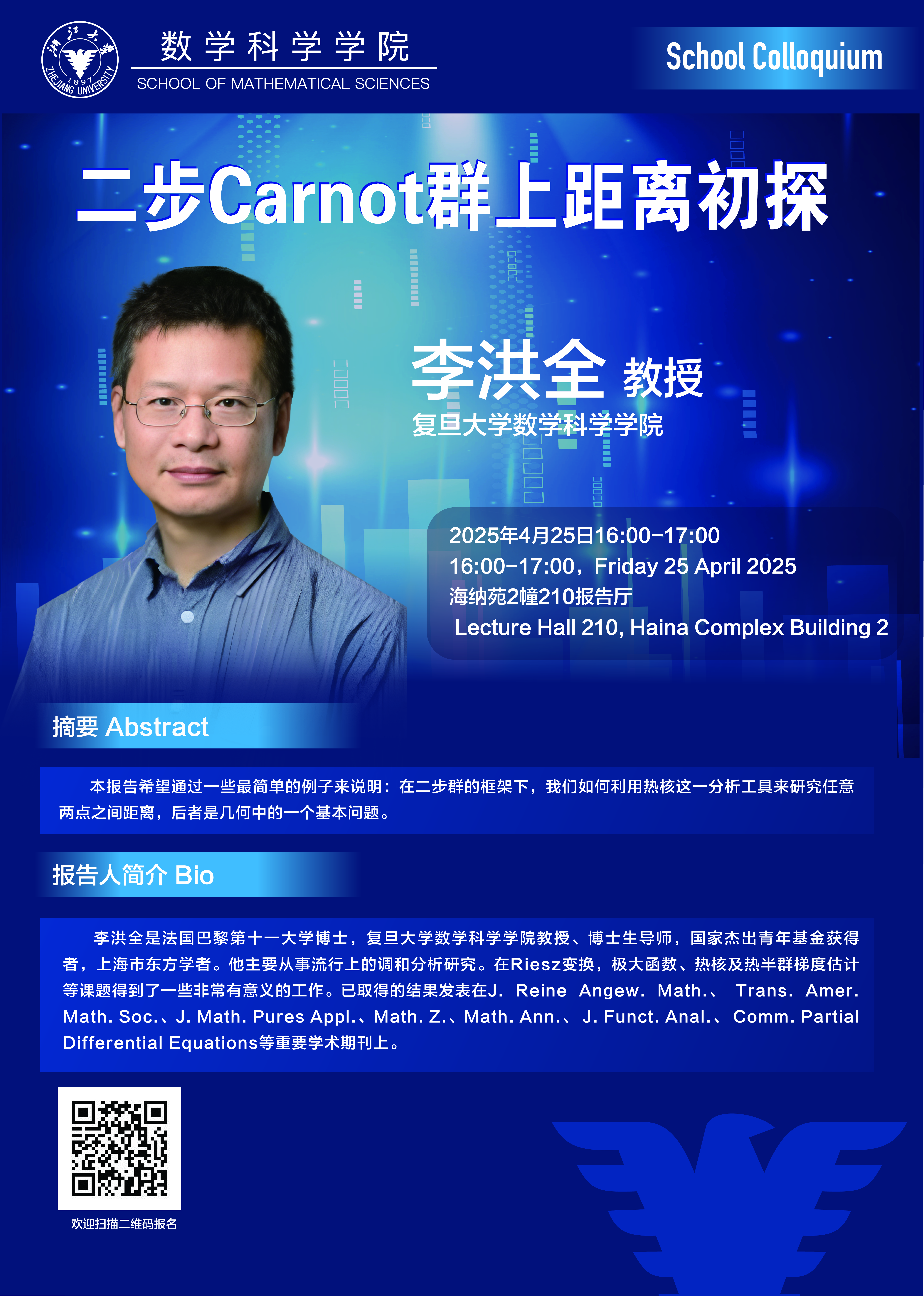 Seminars Seminars School Colloquium Conferences Position : homepage EVENTS Seminars School Colloquium——二步Carnot群上距离初探 2025-04-25 16:00:34 2025-04-25 16:00:34 2025-04-25 16:00:34 Speaker : Hongquan Li, Fudan University Time : 2025-04-25 16:00:34 Location : 210 Haina Complex Building 2 Date: 2025-04-18 Visitcount : 16