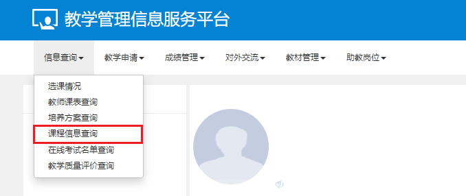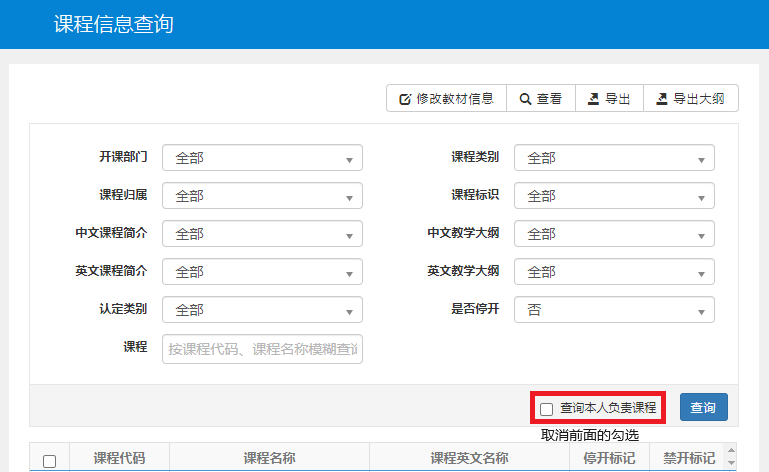 点击信息查询→课程信息查看→输入课程代码或者名称→点击查询(教师查询时请取消勾选“查询本人负责课程”选项),即可查看各课程的详细信息(包括教学大纲、课程类别、课程归属、开课院系、学时和学分等)。
